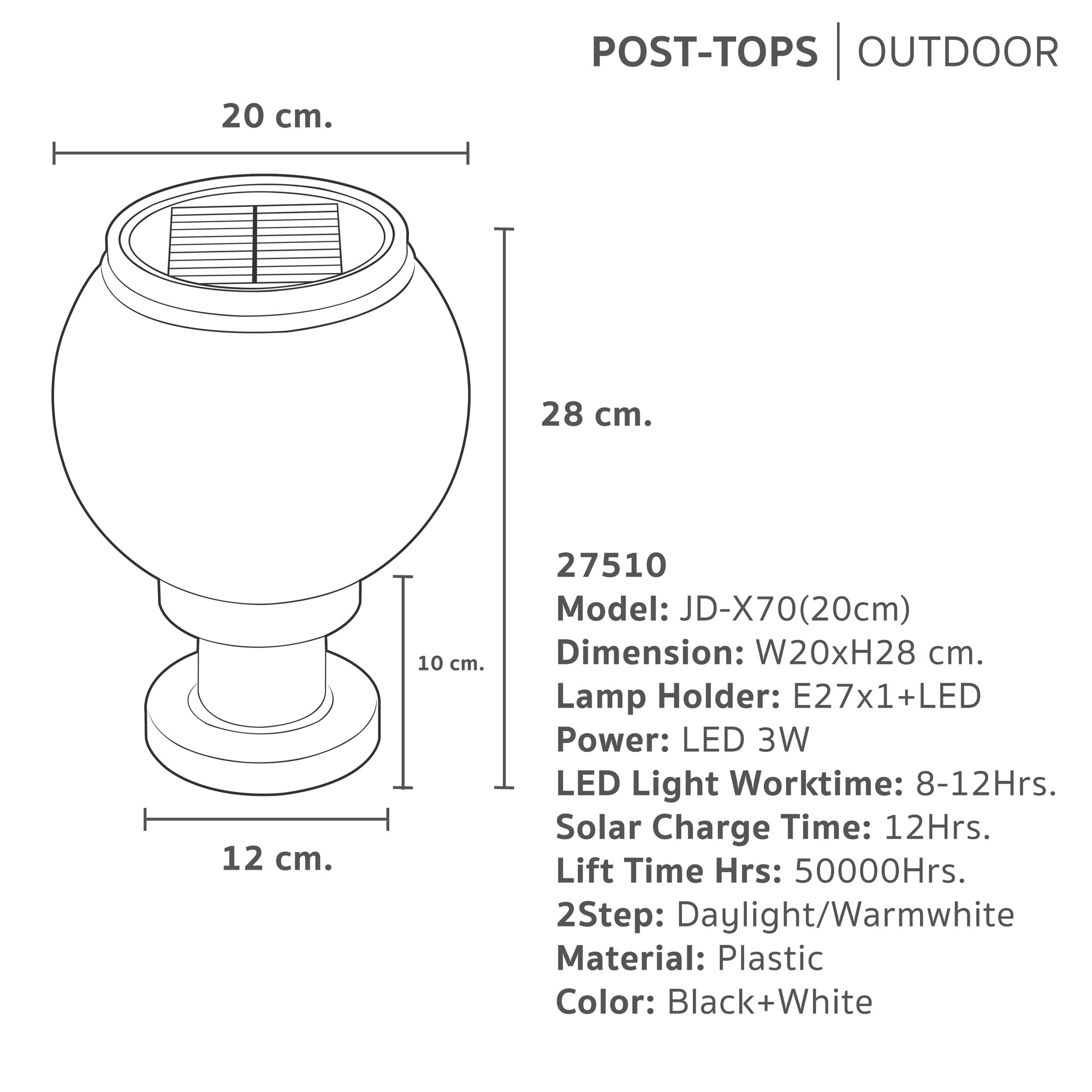 ชื่อสินค้า : โคมหัวเสาโซล่าเซลล์ LED 046/153 3W 8" DL/WW นม (ขาสูง10cm.) (พร้อมขั้วE27)
