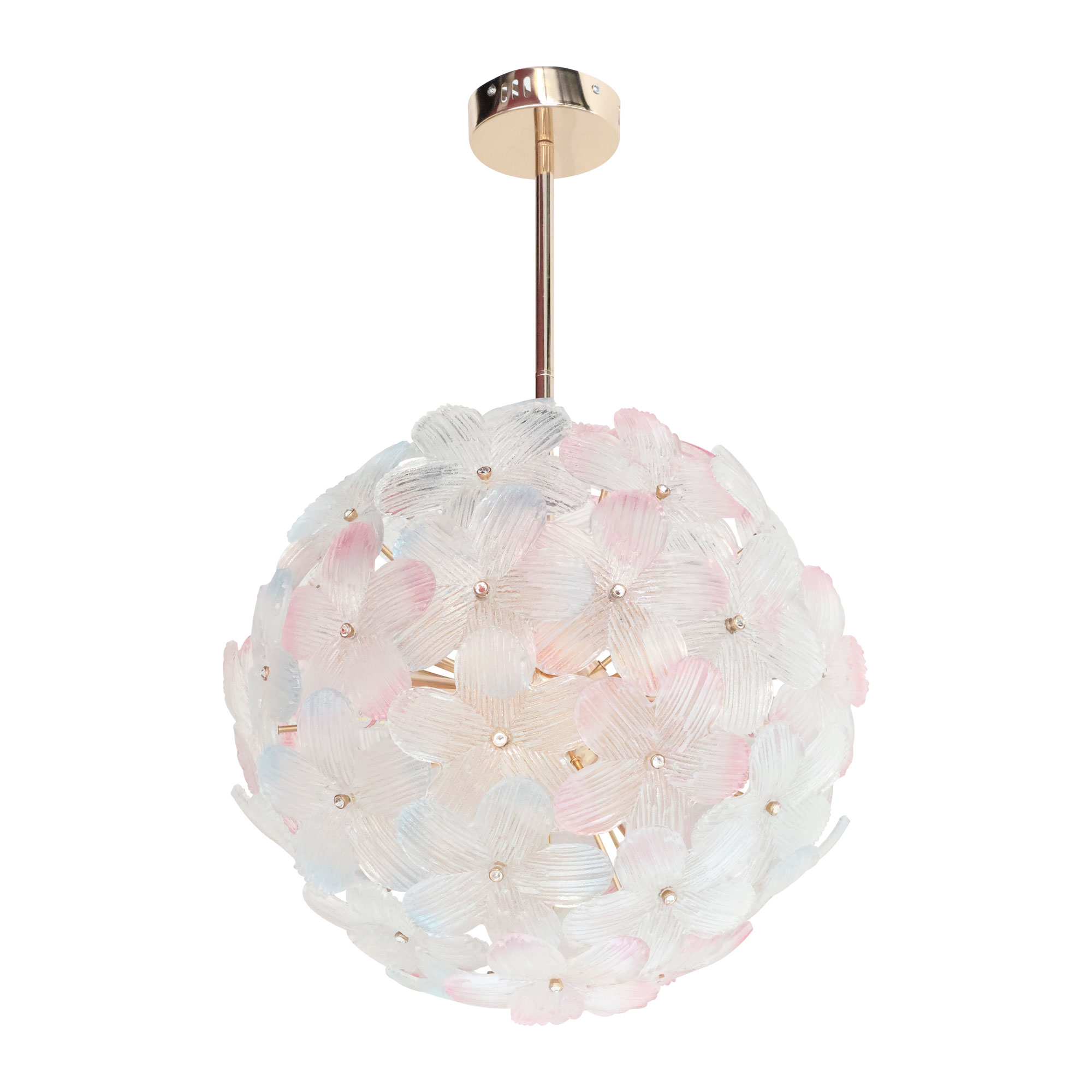 แชทข้อมูลสินค้าโคมช่อ 1049/002 ทรงกลมดอกไม้ สีขาว-ม่วง ก้านทอง ก.40cm. (E14x6)